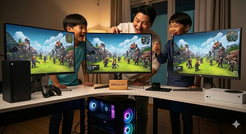 엑박 2대 PC 1대 세팅 끝! 아빠와 아이들이 함께하는 3인 크로스플레이 게임 추천 + 가성비 육아 꿀팁